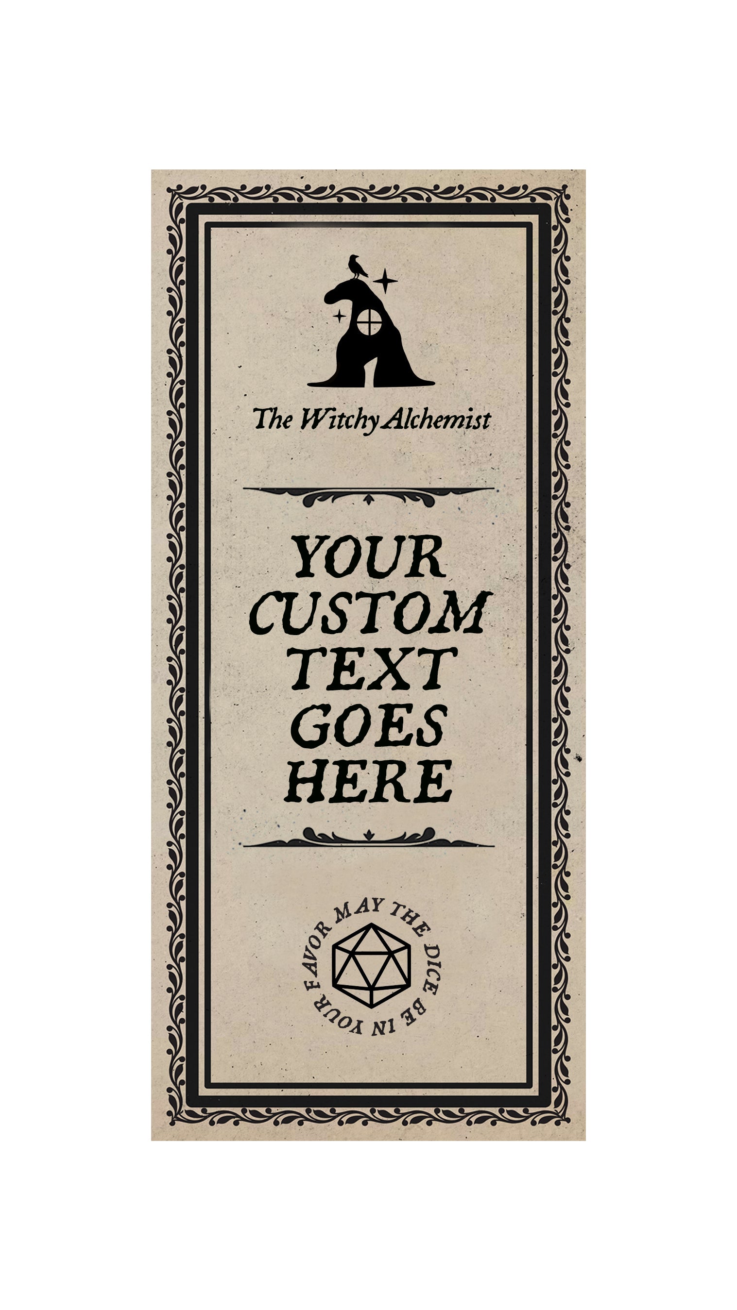 Materials: D20 die, glass bottle, liquid, twine, wax, paper sticker, and hot glue.