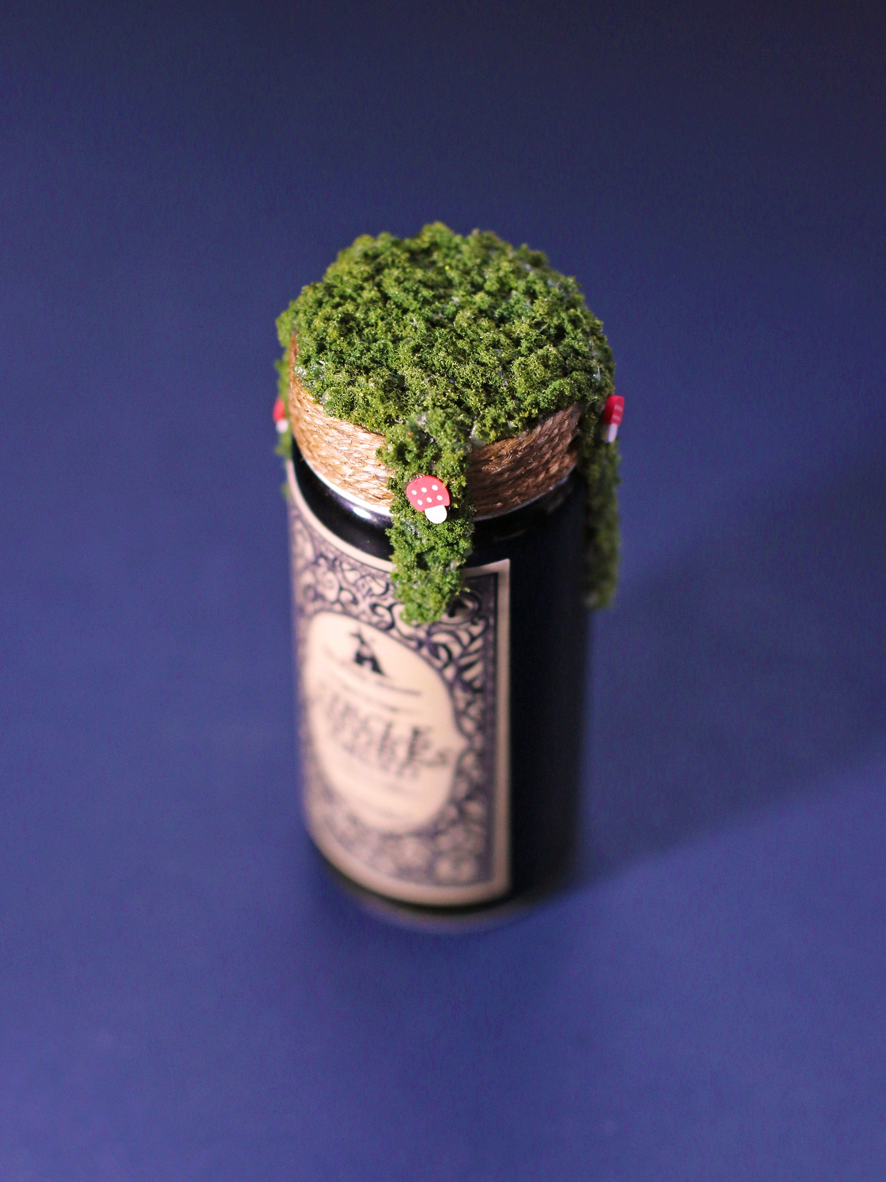PLEASE NOTE: While we use industrial-grade adhesives, the green moss and/or mushrooms that grow on the bottle may fall off over time due to handling. Please only purchase the potion if you are okay with this!