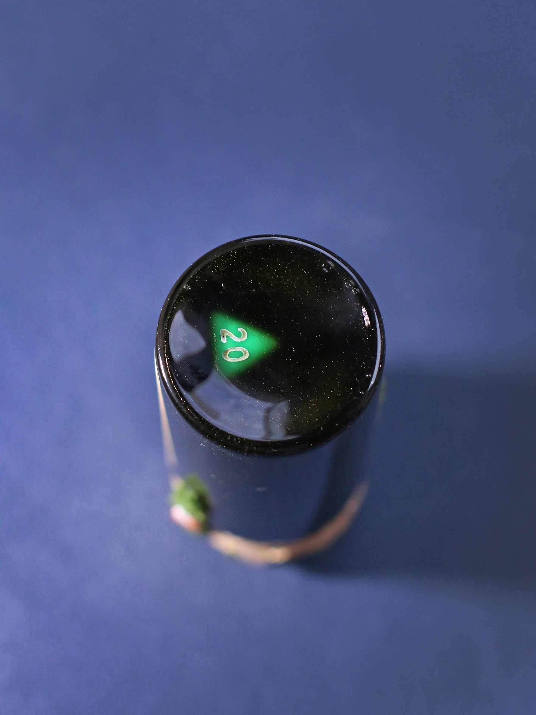 This potion contains a GREEN D20 die that sits in the shimmery, chromatic liquid. The D20 floats to the top to reveal a number when you flip the bottle over and place it on a flat surface.