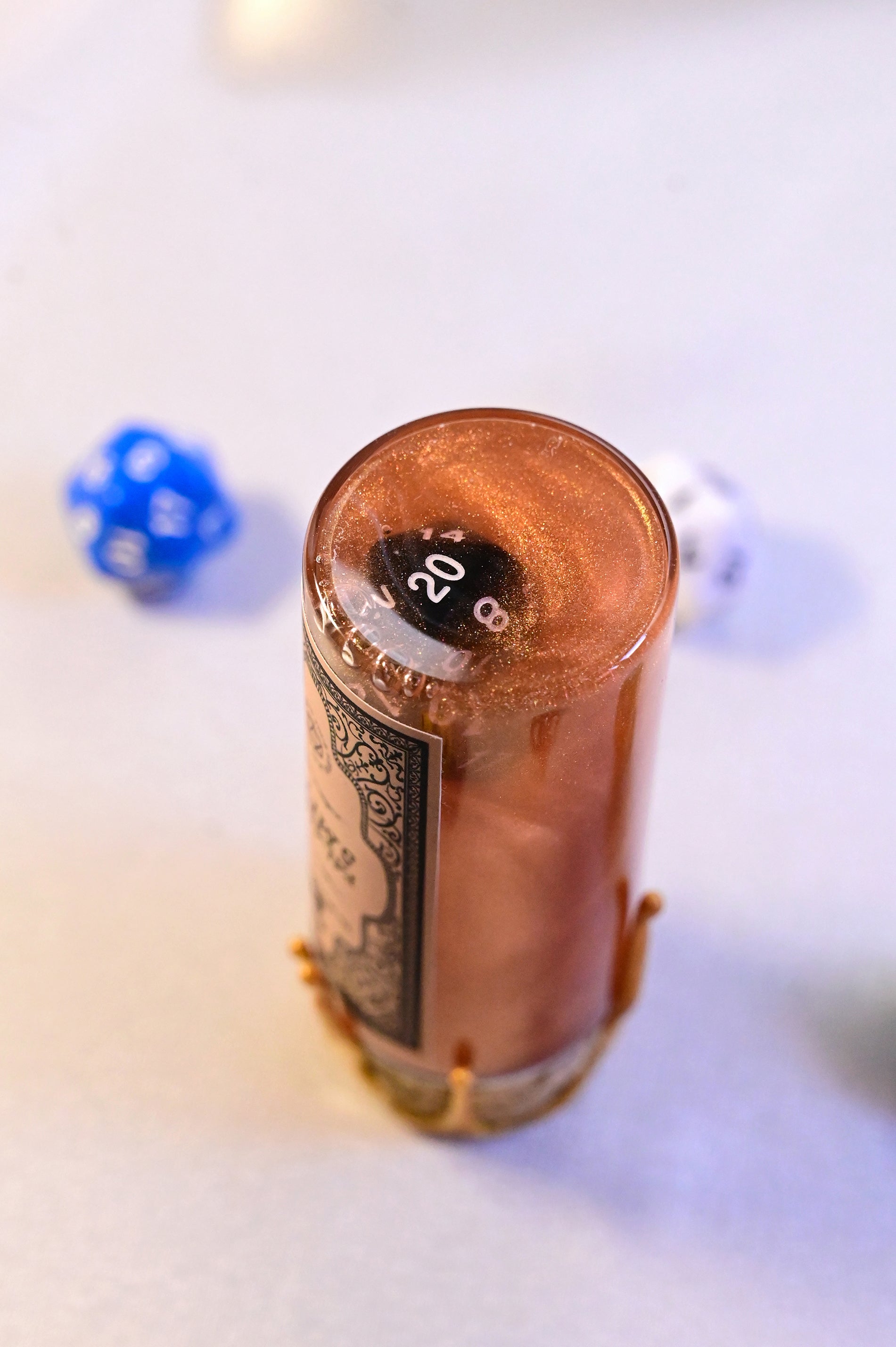 These magical floating dice potions contain a BLACK or WHITE D20 die (colour of die is random) that floats to the top to reveal a number when you flip the bottle over!